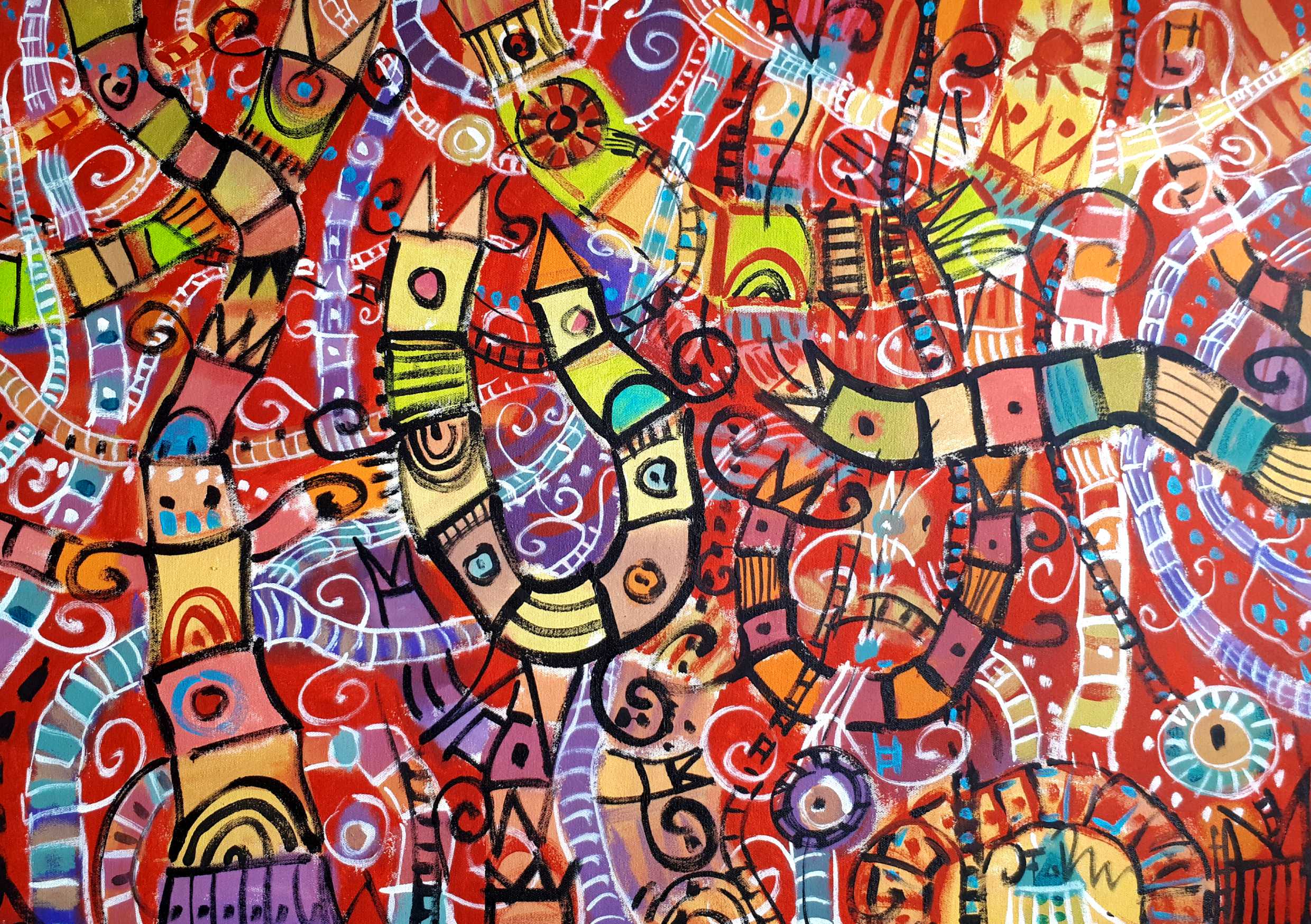 Em suas obras, o artista brinca com as cores e com a liberdade criativa de uma criança. Suas composições sugerem paisagens, bichos, personagens e o que mais a imaginação quiser revelar.